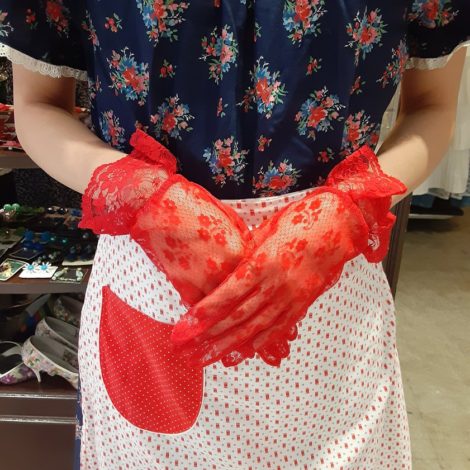 襟に入った赤のパイピングやレース、フリルなど細部まで可愛らしい総柄ワンピースになります。同生地のベルトがついており、ウエストで留めるとドレスのラインが綺麗に見えます。柄はブーケのようにみえる花柄です。素材はコットン100%でスカート部分に裏地がついております。
